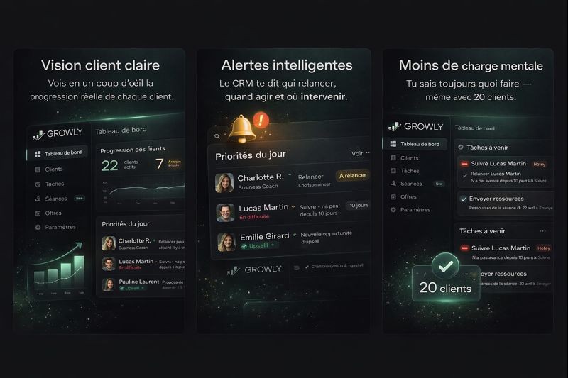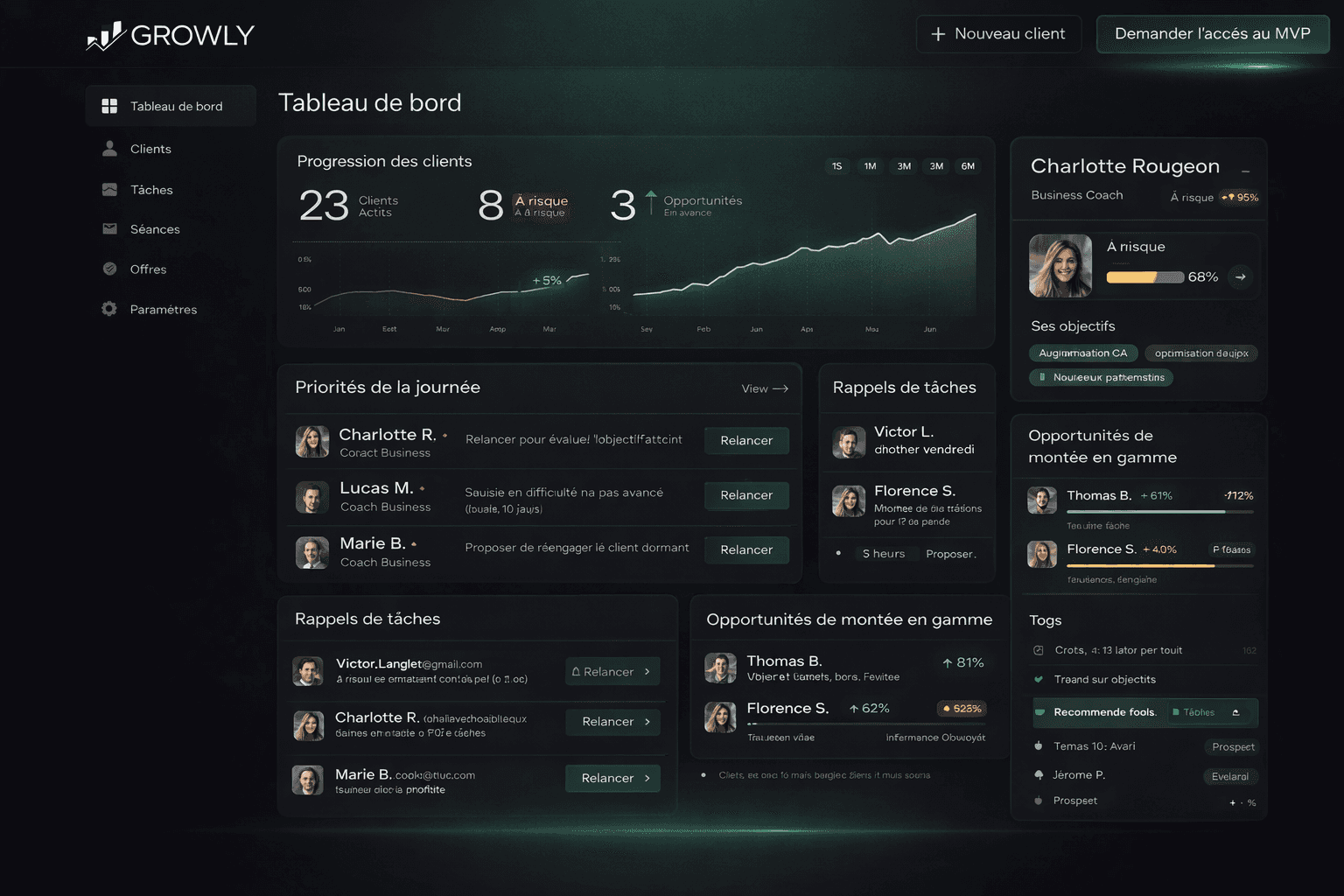 Growly est un CRM conçu spécialement pour les coachs business et consultants indépendants qui accompagnent plusieurs clients en parallèle.